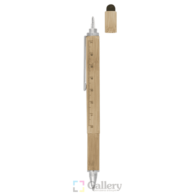 Химикалка със стилус, отвертка, нивелир и линия. Материал: бамбук и метал. Размер на артикула: 10x150x10 mm. Печатаемо поле: 60х6 mm. Печат: тампонен, ситопечат, гравиране.
