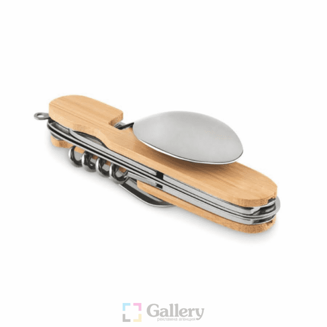 Мултифункционално джобно ножче, прибори за хранене. Материал: дърво и метал. Размер на артикула: 103х35х34 mm. Печатаемо поле: 30х8 mm. Печат: тампонен, гравиране.