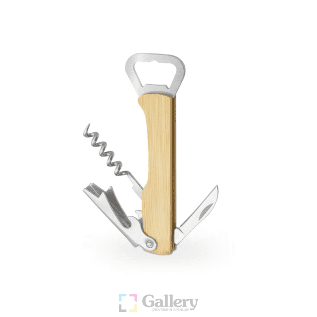 Отварачка четири части – тирбушон, нож, отварачки (2 вида). Материал: дърво и неръждаема стомана. Размер на артикула: 135х20х10 mm. Печатаемо поле: 40х7 mm. Печат: тампонен, гравиране.