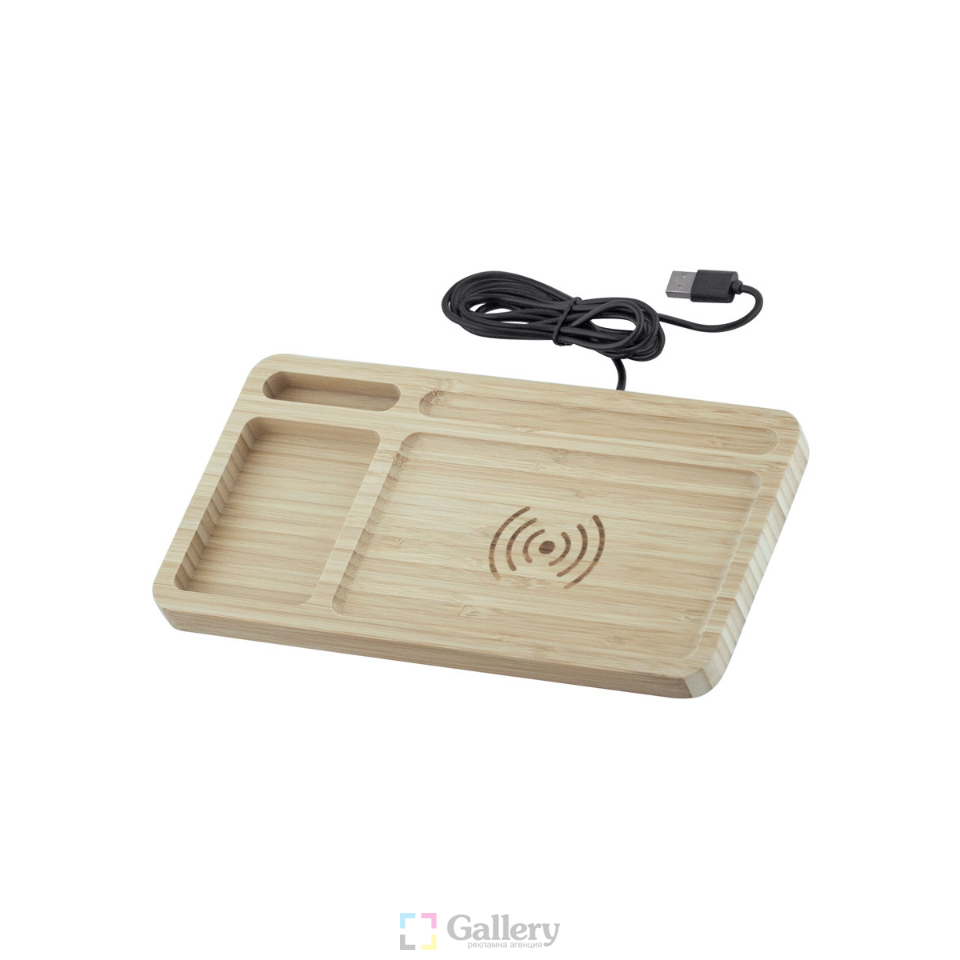 Безжично зарядно за телефон, органайзер за бюро. Материал: бамбук. Размер н артикула: 265x140x15 mm. Печатаемо поле: 40×50 mm. Печат: тампонен, гравиране.