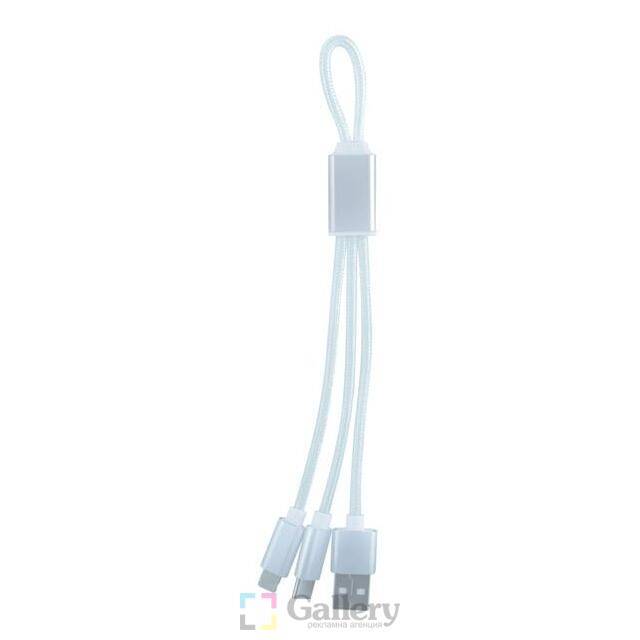 Универсално USB зарядно, 3 накрайника, съвместимо с iPhone и Android, дължина на кабела 190 mm. Материал: полиестер и мета л Размер на артикула: 190×17 mm. Печатаемо поле: 20х7 mm. Печат: тампонен, гравиране