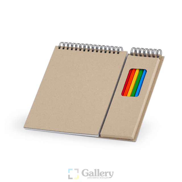 Еко тефтер с 8 цветни моливи, 50 листа без редове, цвят на хартията бял.