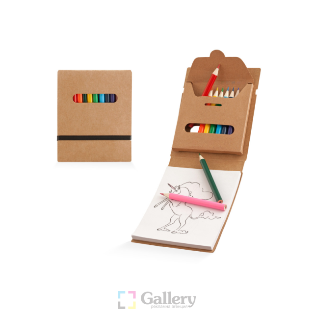 Комплект за оцветяване, 40 бели листа, 10 страници с картинки, 12 цветни молива. Материал: картон, хартия. Размер на артикула: 100х124х17 mm. Печатаемо поле: 50х20 mm. Печат: тампонен, ситопечат.