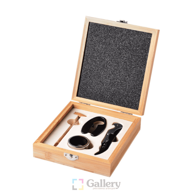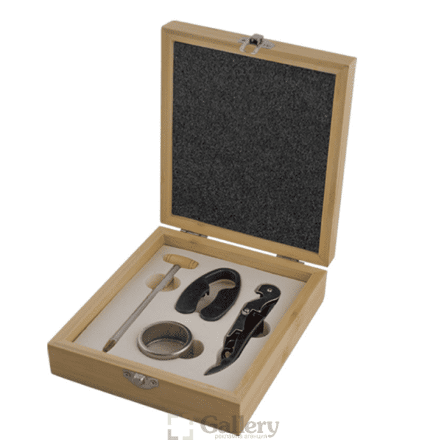 Комплект за вино, 4 части, дървена кутия– тирбушон, ринг за бутилка, нож за фолио, термометър. Материал: дърво и метал. Размер на артикула: 185х155х56 mm. Печатаемо поле: 100х30 mm. Печат: ситопечат, гравиране.